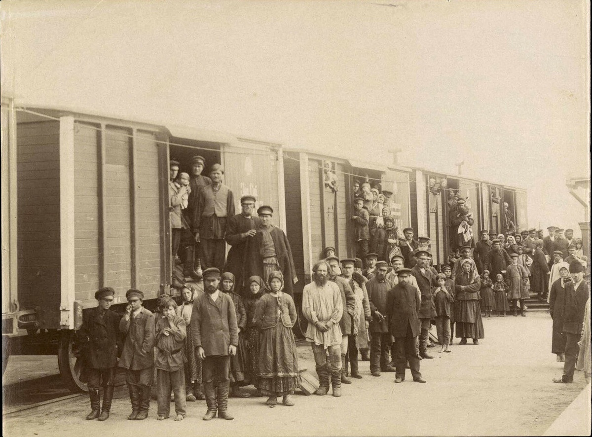 На 1 фото — 1890 год. Русские переселенцы в Сибирь. Столыпинские вагоны.
